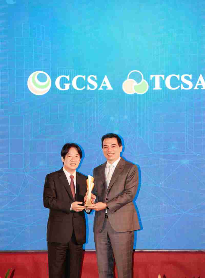 达全方位永续表现获全球永续奖及台湾永续奖肯定,,由副总统赖清德颁奖 (左),,红龙扑克总经理柯富仁 (右) 代表领奖