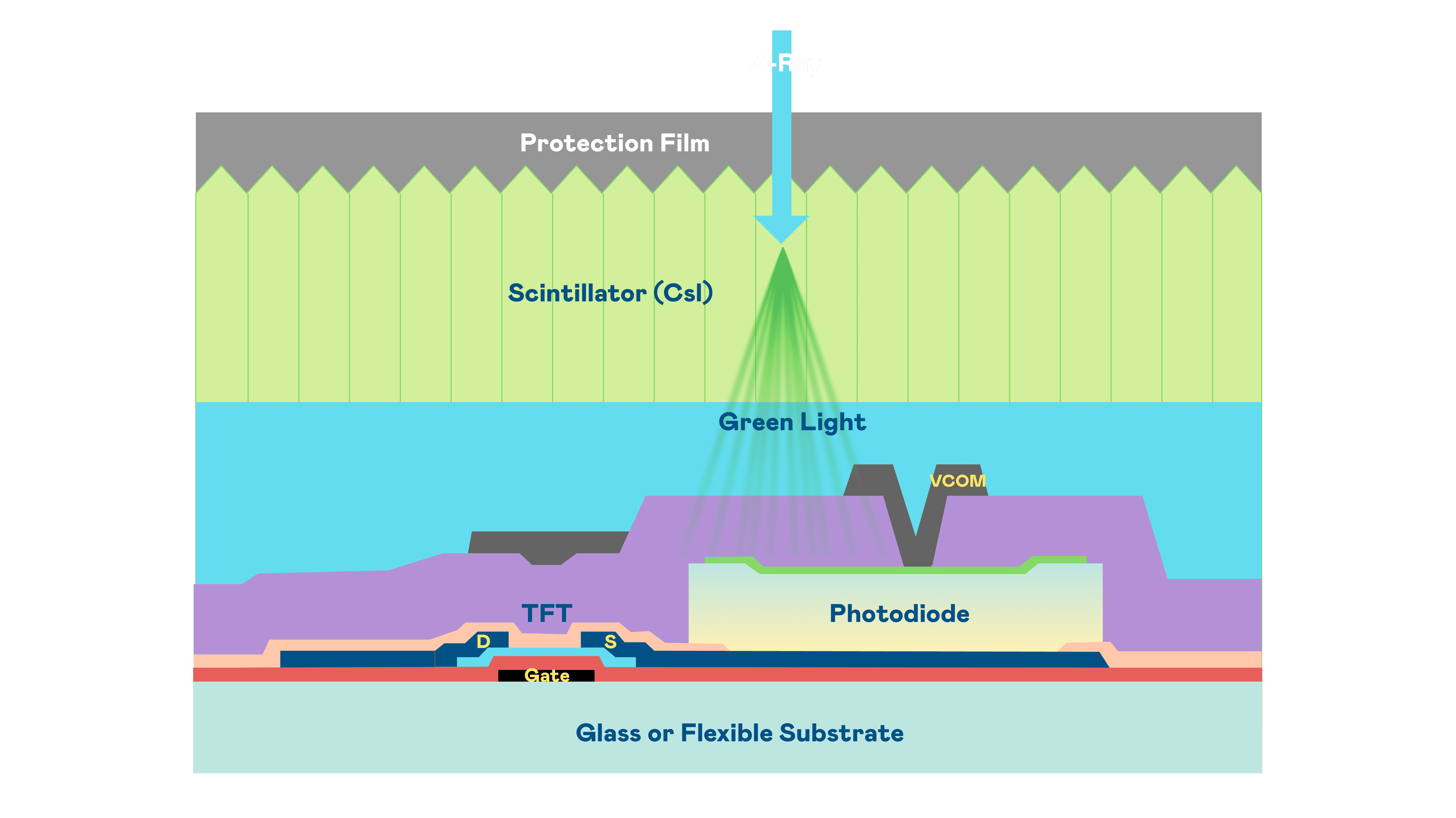 红龙扑克的X光影像感测阵列使用薄膜电晶体 (TFT) 作为每个像素的读取开关,,搭配光电二极体(Photodiode)的光电转换元件,,,用以感测X光影像讯号。。